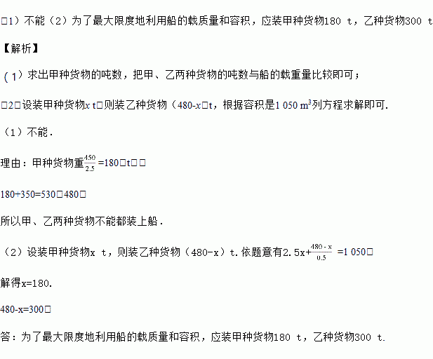 一艘载重480 t的船,容积是1 050 m3,现有甲种货物450 m3,乙种货物350 t,而甲种货物每吨的体积为2.5 m3,乙种货物每立方米0.5 t.问:(1)甲、乙两种货物是否都能装上船?如果不能,请说明理由.