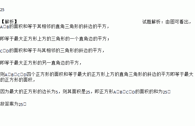 如图所示的图形中,所有的四边形都是正方形,所有的三角形都是直角三角形,其中最大的正方形的边长为5,则正方形A,B,C,D的面积的和为________