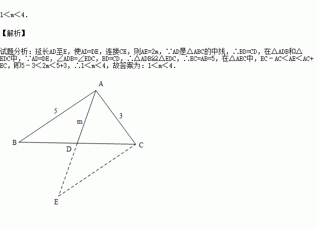 △ABC中,AB=5,AC=3,AD是△ABC的中线,设AD长为m,则m的取值范围是 .