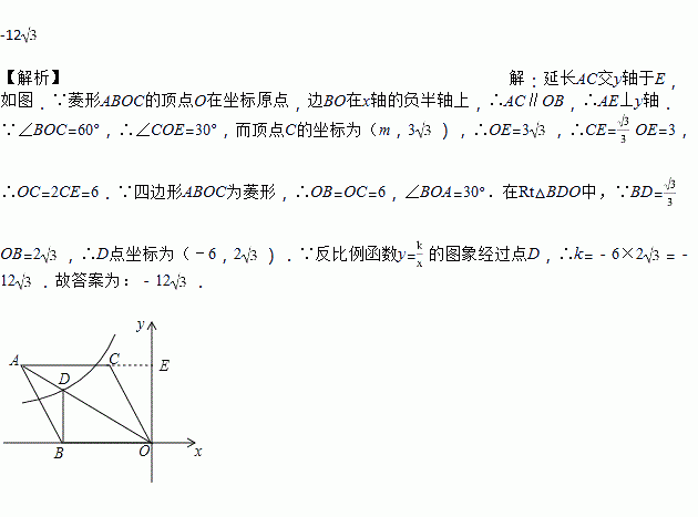 如图,在平面直角坐标系中,菱形ABOC的顶点O在坐标原点,边BO在x轴的负半轴上,∠BOC=60°,顶点C的坐标为(m,3