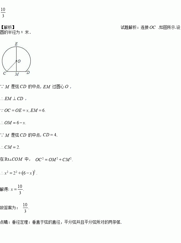 中弦CD的中点,EM经过圆心O交⊙O于点E,若CD=4 m,EM=6 m,则⊙O的半径为__m.