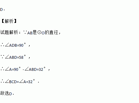 D. 【解析】 试题解析:∵AB是⊙O的直径, ∴∠ADB=90°, ∵∠ABD=58°, ∴∠A=90°-∠ABD=32°, ∴∠BCD=∠A=32°. 故选D.