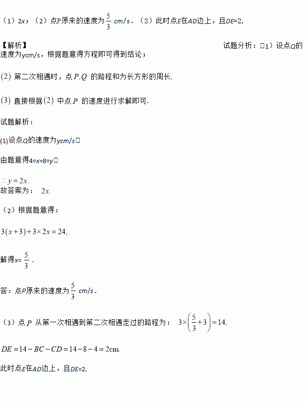 如图,长方形ABCD中,AB=4cm,BC=8cm.点P从点A出发,沿AB匀速运动;点Q从点C出发,沿C→B→A→D→C的路径匀速运动.两点同时出发,在B点处首次相遇后,点P的运动速度每秒提高了3cm,并沿B→C→D→A的路径匀速运动;点Q保持速度不变,继续沿原路径匀速运动,3s后两点在长方形ABCD某一边上的E点处第二次相遇后停止运动.设点P原来的速度为xcm/s.