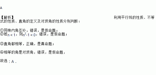 ①同旁内角互补;②若n<1,则n2-1<0;③直角都相等;④相等的角是对顶角.