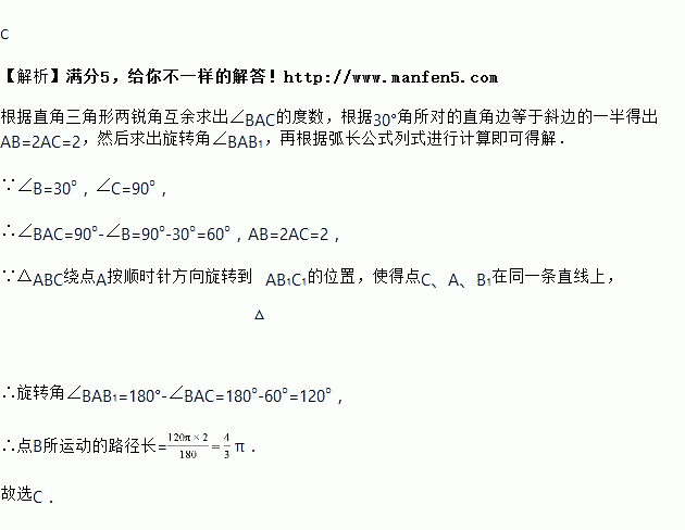 如图,将,其中,,,绕点按顺时针方向旋转到的位置,使得点、、在同一条直线上,那么,点所运动的路径长( )