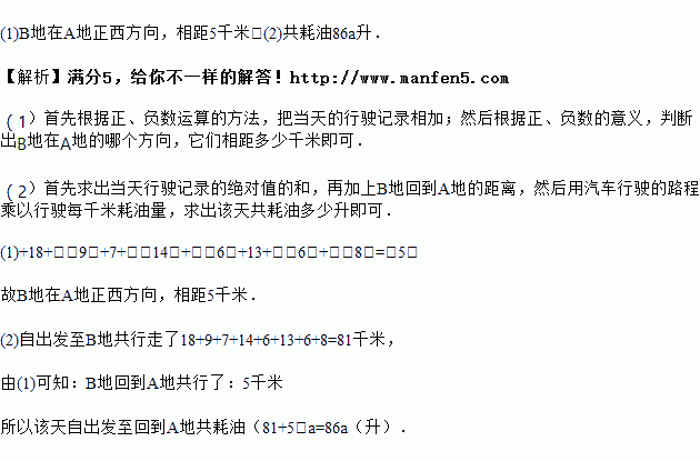某公路养护小组乘车沿东西向公路巡视维护.某天早晨从A地出发,晚上到达B地.约定向东为正方向,行走记录如下(单位千米):+18,﹣9,+7,﹣14,﹣6,+13,﹣6,﹣8.