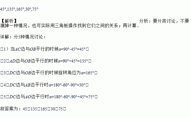 一副三角板按如图所示叠放在一起,若固定,将绕着公共顶点,按顺时针方向旋转度,当的一边与的某一边平行时,相应的旋转角的度数为_________________。
