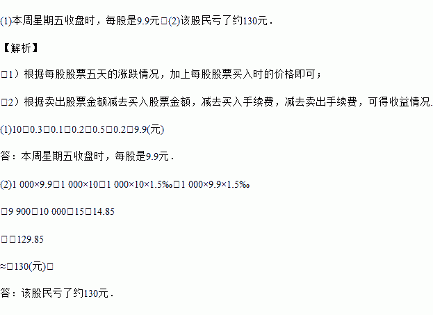(2)已知买进股票和卖出股票时都需付成交额的1.5‰作为手续费,如果在本周星期五收盘时将全部股票一次性卖出,那么该股民的收益情况如何?(精确到个位数)