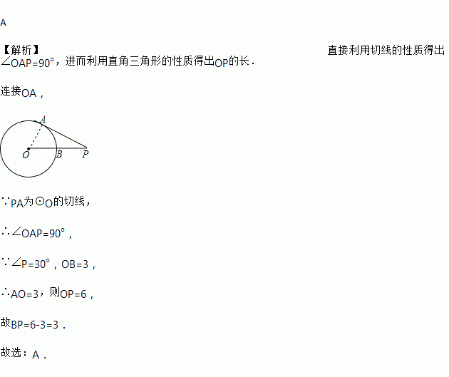 如图,点P为⊙O外一点,PA为⊙O的切线,A为切点,PO交⊙O于点B,∠P=30°,OB=3,则线段BP的长为( )