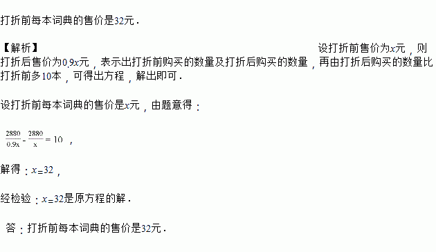 为丰富校园文化生活,某校举办了成语大赛.学校准备购买一批成语词典奖励获奖学生.购买时,商家给每本词典打了九折,用 2880 元钱购买的成语词典,打折后购买的数量比打折前多 10 本.求打折前每本笔记本的售价是多少元?