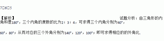 若三角形三个内角度数的比为2:3:4,则相应的外角比是__.