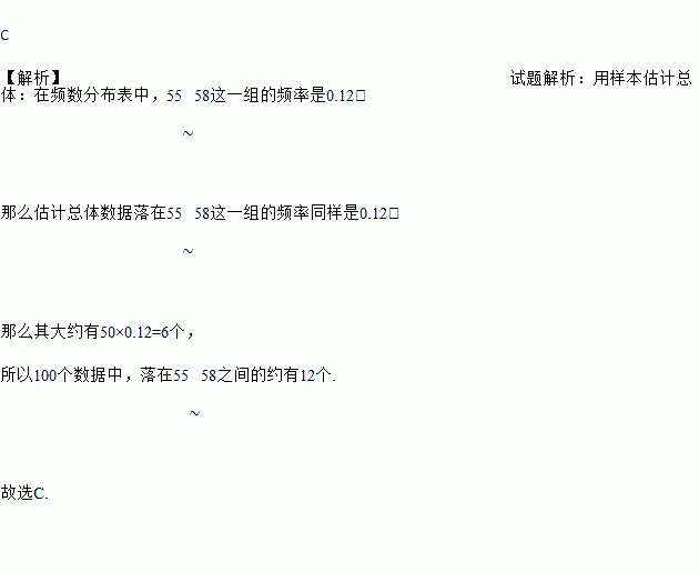 在100个数据中,用适当的方法,抽取50个作为样本进行统计,频数分布表中55~58这一组数据的频率是0.12,那么估计这100个数据中,落在55~58之间的约有( )