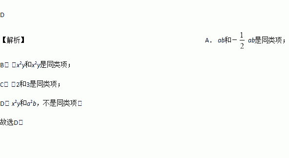 A. ab和-ab B. -x2y和x2y C. -2和3 D. x2y和a2b