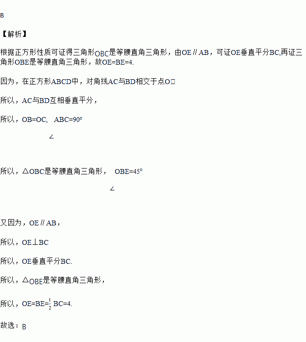 如图,已知在正方形ABCD中,对角线AC与BD相交于点O,OE∥AB交BC于点E.若AD=8cm,则OE的长为( )