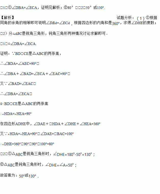 (2)若△ABC中,∠A=50°,直接写出∠DHE的度数是 .