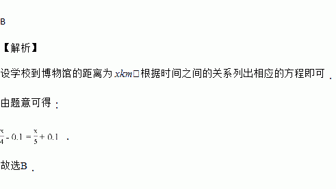 甲、乙两人从学校到博物馆去,甲每小时走 4km,乙每小时走 5km,甲先出发 0.1h,结果乙还比甲早到 0.1h.设学校到博物馆的距离为 xkm,则以下方程正确的是( )