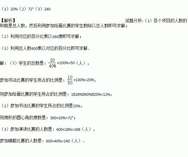 (2)求出扇形统计图中参加书法比赛的学生所在扇形圆心角的度数?