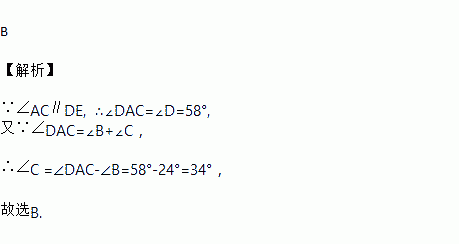 如图,已知 AC∥DE,∠B=24°,∠D=58°,则∠C=( )