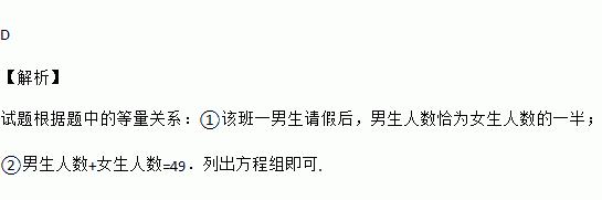 某班共有学生49人.一天,该班某男生因事请假,当天的男生人数恰为女生人数的一半.若设该班男生人数为x,女生人数为y,则下列方程组中,能计算出x,y的是( )
