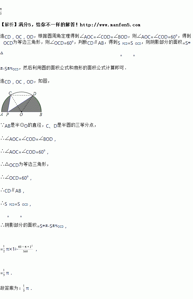 如图,是半的直径,、是半圆的三等分点,若,是直径上的任意一点,则图中阴影部分的面积是________.