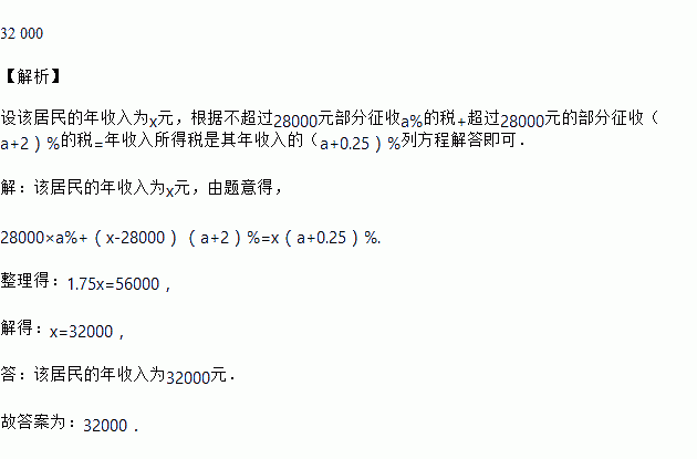 某地居民年收入所得税的征收标准如下:不超过28 000元部分征收a%的税,超过28 000元的部分征收(a+2)%的税.如果某居民年收入所得税是其年收入的(a+0.25)%,那么该居民的年收入为__________元.