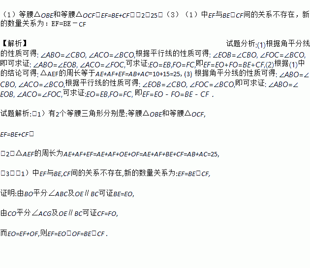 (3)如图2,若△ABC中,∠B的平分线与三角形外角∠ACG的平分线CO交于点O,过O点作OE∥BC交AB于E,交AC于F,请问(1)中EF与BE、CF间的关系还是否存在,若存在,说明理由;若不存在,写出三者新的数量关系,并说明理由.