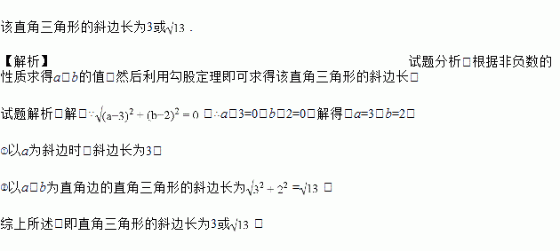 已知a,b,c为一个直角三角形的三边长,且有+(b-2)2=0,求该直角三角形的斜边长.