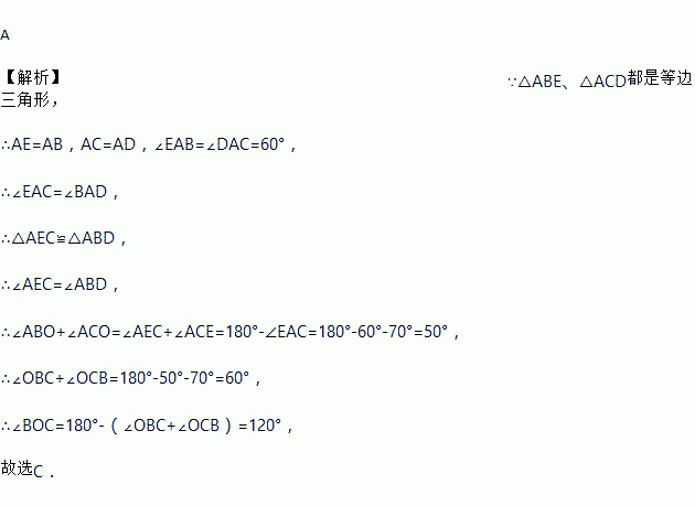 A 【解析】∵△ABE、△ACD都是等边三角形, ∴AE=AB,AC=AD,∠EAB=∠DAC=60°, ∴∠EAC=∠BAD, ∴△AEC≌△ABD, ∴∠AEC=∠ABD, ∴∠ABO+∠ACO=∠AEC+∠ACE=180°-∠EAC=180°-60°-70°=50°, ∴∠OBC+∠OCB=180°-50°-70°=60°, ∴∠BOC=180...