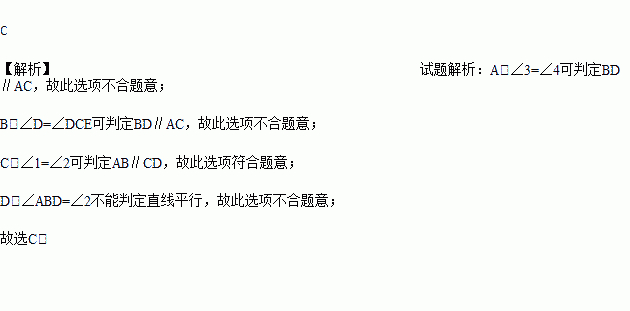 A. ∠3=∠4 B. ∠D=∠DCE C. ∠1=∠2 D. ∠ABD=∠2