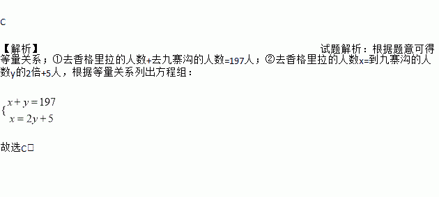 鸿运旅行社组织了197人到香格里拉和九寨沟旅游,到香格里拉的人数x比到九寨沟的人数y的2倍多5人,则下面所列的方程组中符合题意的是( )