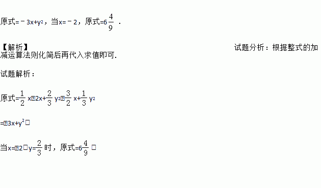 先化简,再求值. x﹣2(x﹣y2)+(﹣x+y2),其中x=﹣2,y=.