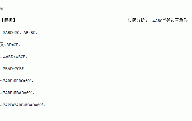 如图,已知等边△ABC中,BD=CE,AD与BE相交于点P,则∠APE的度数是_____________度.