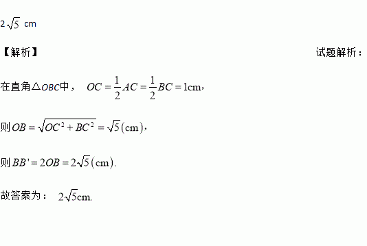 在等腰三角形ABC中,∠C=90°,BC=2cm,如果以AC的中点O为旋转中心,将△ABC旋转180°,点B落在B′处,则BB′的长度为________.
