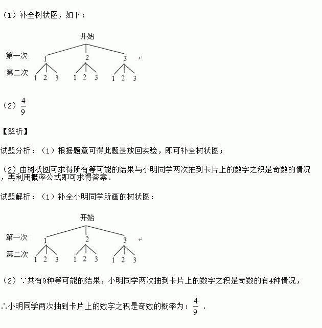 老师和小明同学玩数学游戏.老师取出一个不透明的口袋,口袋中装有三张分别标有数字1,2,3的卡片,卡片除数字外其余都相同,老师要求小明同学两次随机抽取一张卡片,并计算两次抽到卡片上的数字之积是奇数的概率.于是小明同学用画树状图的方法寻求他两次抽取卡片的所有可能结果.如图是小明同学所画的正确树状图的一部分.