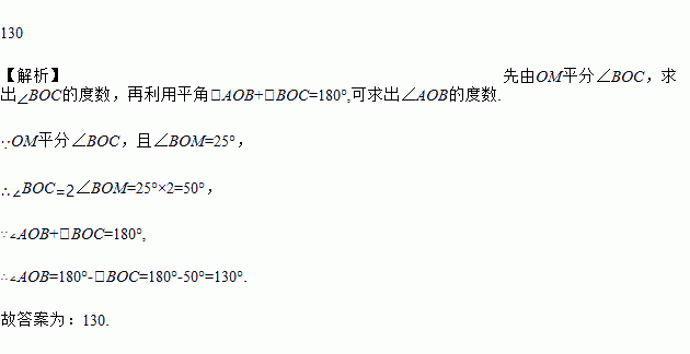 如图,点A、O、C在一条直线上,OM平分∠BOC,且∠BOM=25°,则∠AOB=_____度.