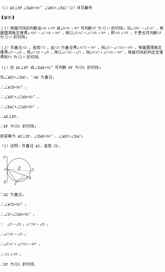 (1)如图①,AB是直径,要使EF是⊙O的切线,还须添加一个条件是(只需写出三种情况).