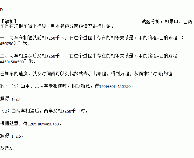 D 【解析】试题分析:如果甲、乙两车是在环形车道上行驶,则本题应分两种情况进行讨论: 一、两车在相遇以前相距50千米,在这个过程中存在的相等关系是:甲的路程+乙的路程=(450﹣50)千米; 二、两车相遇以后又相距50千米.在这个过程中存在的相等关系是:甲的路程+乙的路程=450+50=500千米. 已知车的速度,以及时间就可以列代数式表示出路程,得到方程,从而求出时间t的...