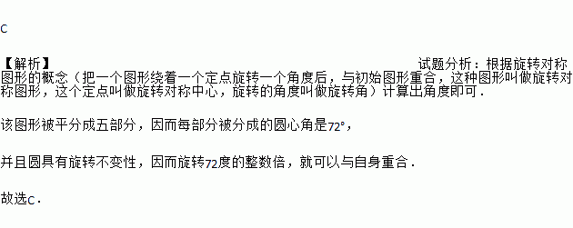 C ¡¾½âÎö¡¿ÊÔÌâ·ÖÎö£º¸ù¾ÝÐýת¶Ô³ÆÍ¼ÐεĸÅÄ°ÑÒ»¸öͼÐÎÈÆ×ÅÒ»¸ö¶¨µãÐýתһ¸ö½Ç¶Èºó£¬Óë³õʼͼÐÎÖØºÏ£¬ÕâÖÖͼÐνÐ×öÐýת¶Ô³ÆÍ¼ÐΣ¬Õâ¸ö¶¨µã½Ð×öÐýת¶Ô³ÆÖÐÐÄ£¬ÐýתµÄ½Ç¶È½Ð×öÐýת½Ç£©¼ÆËã³ö½Ç¶È¼´¿É£® ¸ÃͼÐ௒½·Ö³ÉÎ岿·Ö£¬Òò¶øÃ¿²¿·Ö±»·Ö³ÉµÄÔ²ÐĽÇÊÇ72¡ã£¬ ²¢ÇÒÔ²¾ßÓÐÐýת²»±äÐÔ£¬Òò¶øÐýת72¶ÈµÄÕûÊý±¶£¬¾Í¿ÉÒÔÓë×ÔÉíÖØºÏ£® ¹ÊÑ¡C£®