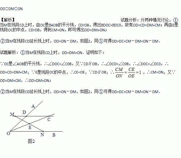 如图,过∠AOB的平分线上一点C作CD∥OB交OA于点D,E是线段OC的中点,过点E作直线分别交射线CD,OB于点M,N,探究线段OD,ON,DM之间的数量关系,并证明你的结论.
