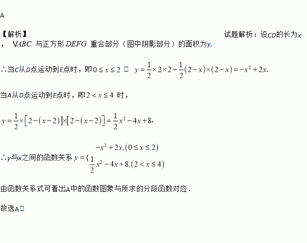 如图所示,△ABC为等腰直角三角形,∠ACB=90°,AC=BC=2,正方形DEFG边长也为2,且AC与DE在同一直线上,△ABC从C点与D点重合开始,沿直线DE向右平移,直到点A与点E重合为止,设CD的长为x,△ABC与正方形DEFG重合部分(图中阴影部分)的面积为y,则y与x之间的函数关系的图象大致是( )