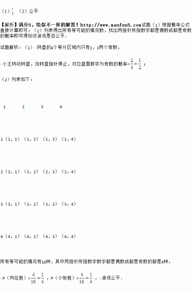 (1)小王转动转盘,当转盘停止转动时,对应盘面数字为奇数的概率是多少?