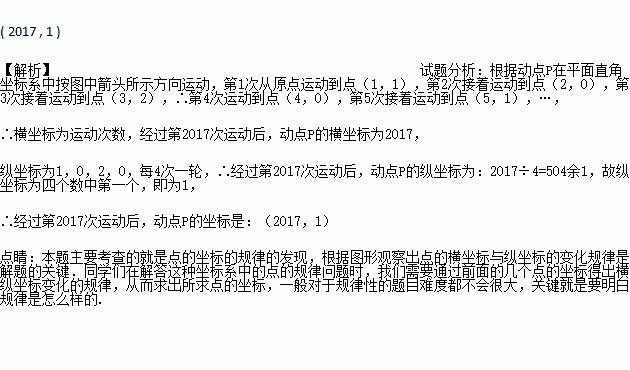 如图,动点P在平面直角坐标系中按图中箭头所示方向运动,第1次从原点运动到点(1,1),第2次接着运动到点(2,0),第3次接着运动到点(3,2),…,按这样的运动规律,经过第2017次运动后,动点P的坐标是______.