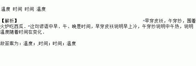 温度 时间 时间 温度 【解析】“早穿皮袄,午穿纱,围着火炉吃西瓜.”这句谚语中早、午、晚是时间,早穿皮袄说明早上冷,午穿纱说明中午热,说明温度随着时间在变化. 故答案为:温度;.时间;时间;温度