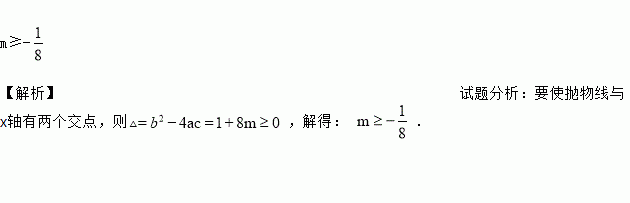 m≥- 【解析】试题分析:要使抛物线与x轴有两个交点,则,解得: .
