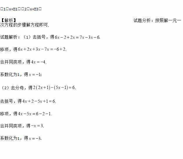 (1)6x﹣2(1﹣x)=7x﹣3(x+2);(2).