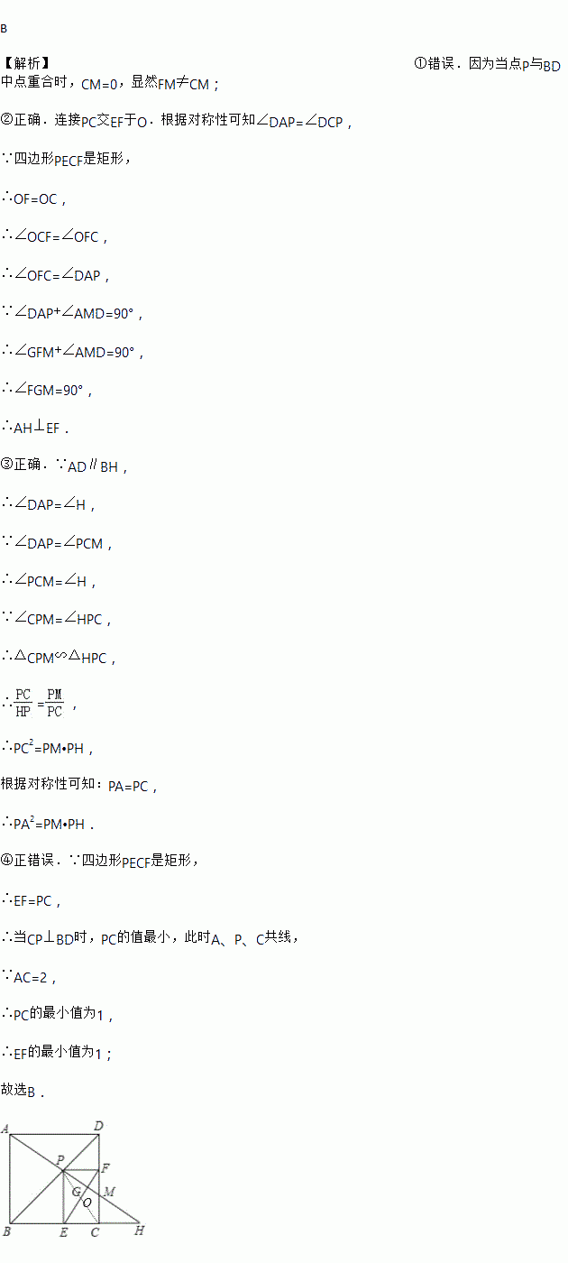 的正方形ABCD的对角线BD上的动点,过点P分别作PE⊥BC于点E,PF⊥DC于点F,连接AP并延长,交射线BC于点H,交射线DC于点M,连接EF交AH于点G,当点P在BD上运动时(不包括B、D两点),以下结论中:①MF=MC;②AH⊥EF;③AP2=PM•PH;④EF的最小值是