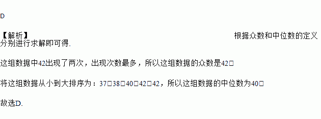 五名女生的体重(单位:kg)分别为:37、40、38、42、42,这组数据的众数和中位数分别是( )