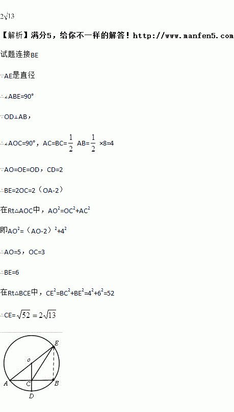 如图,⊙O的半径OD垂直于弦AB,垂足为点C,连接AO并延长交⊙O于点E,连接EC.若AB=8,CD=2,则EC的长为________.