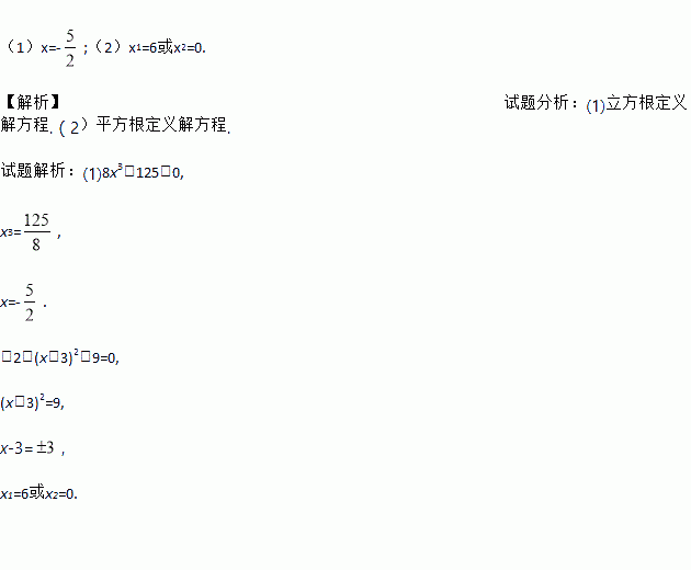 (1)x=-;(2)x1=6或x2=0. 【解析】试题分析:(1)立方根定义解方程.(2)平方根定义解方程. 试题解析:(1)8x3+125=0, x3=, x=-. (2)(x-3)2-9=0, (x-3)2=9, x-3=, x1=6或x2=0.