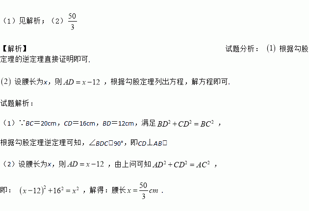 已知等腰三角形ABC的底边BC=20cm,D是腰AB上一点,且CD=16cm,BD=12cm.